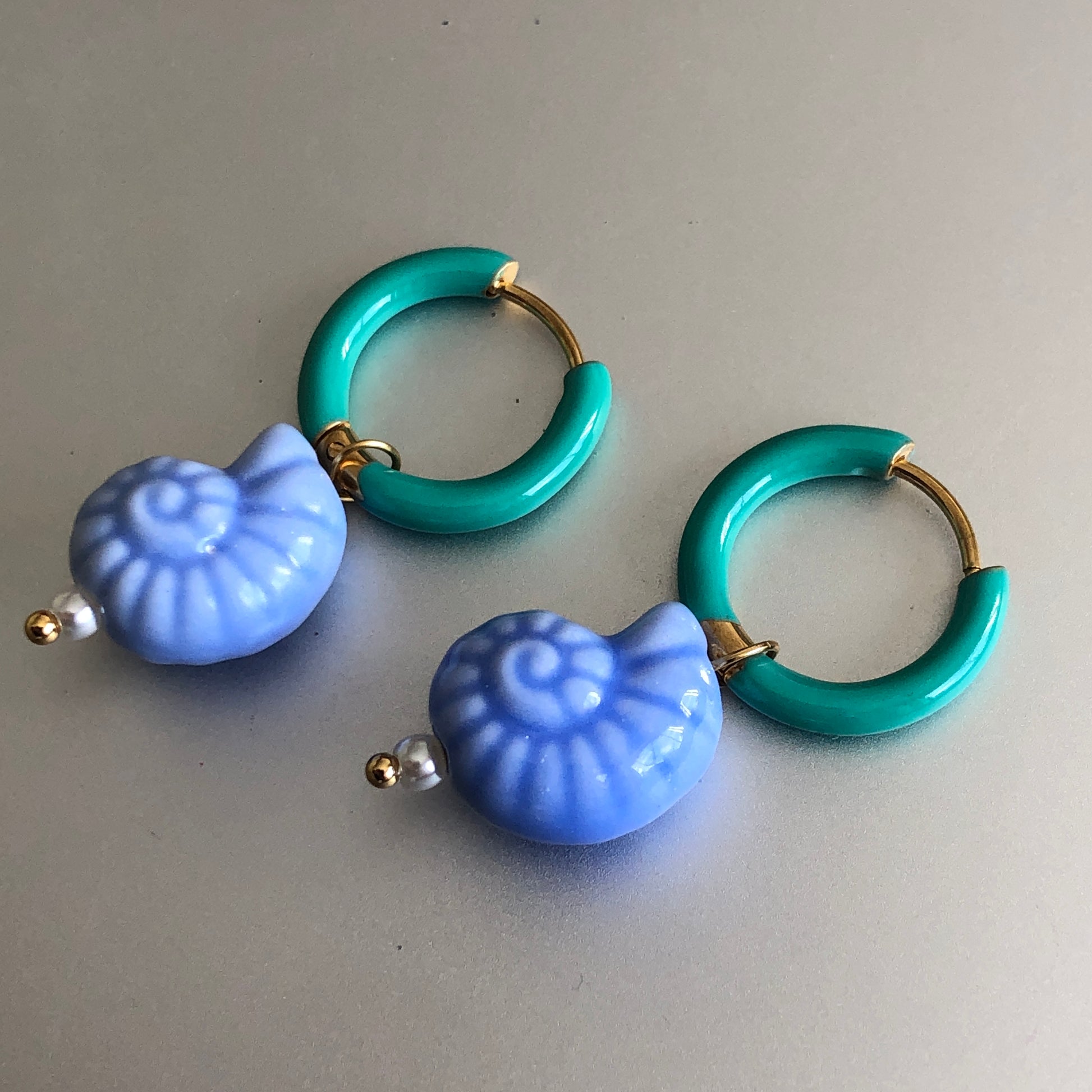 Statement hoop earrings featuring spiral-shaped ceramic pendants in soft blue and turquoise tones. The organic form is inspired by natural ocean structures, creating a refined and artistic look.