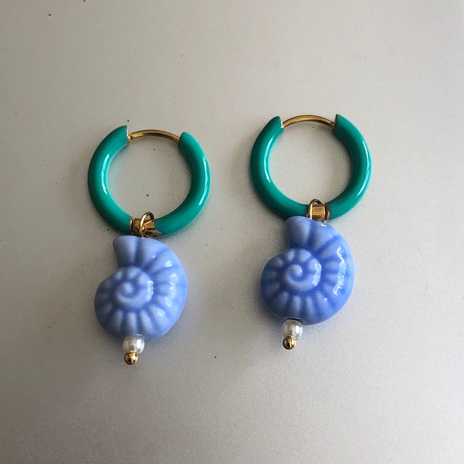 Ausdrucksstarke Creolen mit spiralgeformten Anhängern aus Keramik in sanften Blau- und Türkistönen. Die organische Form erinnert an natürliche Strukturen des Meeres und verleiht dem Design eine besondere Tiefe und Eleganz.